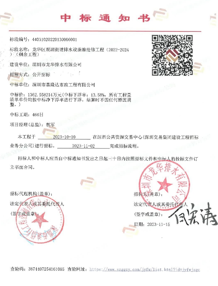 喜訊!公司中標(biāo)龍華區(qū)觀湖街道排水設(shè)施維搶修工程(2022-2024)(剩余工程)